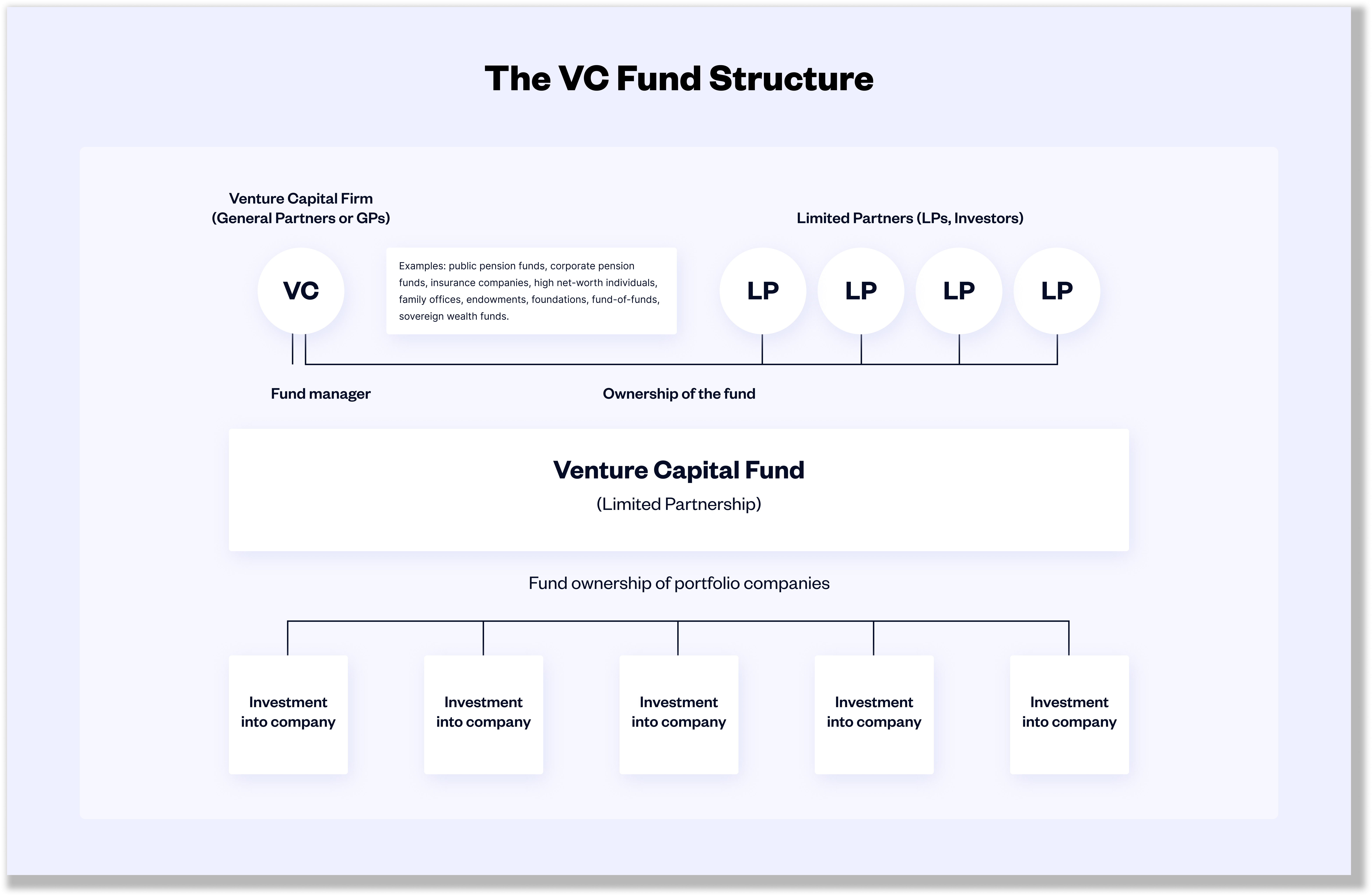 They are composed of Limited Partners (LPs) and a General Partner (GP). The GP is the company owned and run by the "VC" you meet at some networking event. The VC has formed these companies and raised money from LPs. Part of the structure of the fund is that it will exist for no more than 10 years. At the end of that time all proceeds or investment holdings will be sent back to the LPs (minus any fees for the GP).
